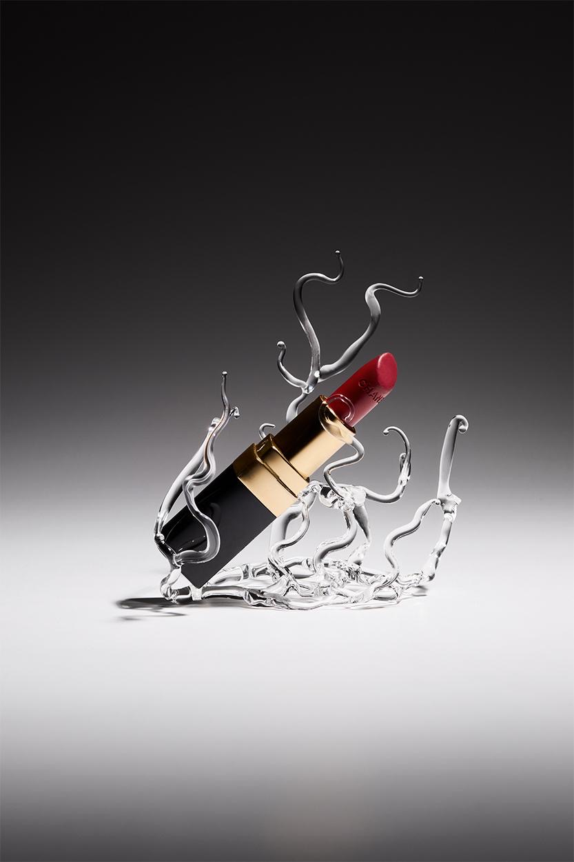 Après une première exploration autour du flacon de parfum Chanel n°5, cette seconde pièce s’est construite autour d’un rouge à lèvres, objet tout aussi iconique, intime et fort.
