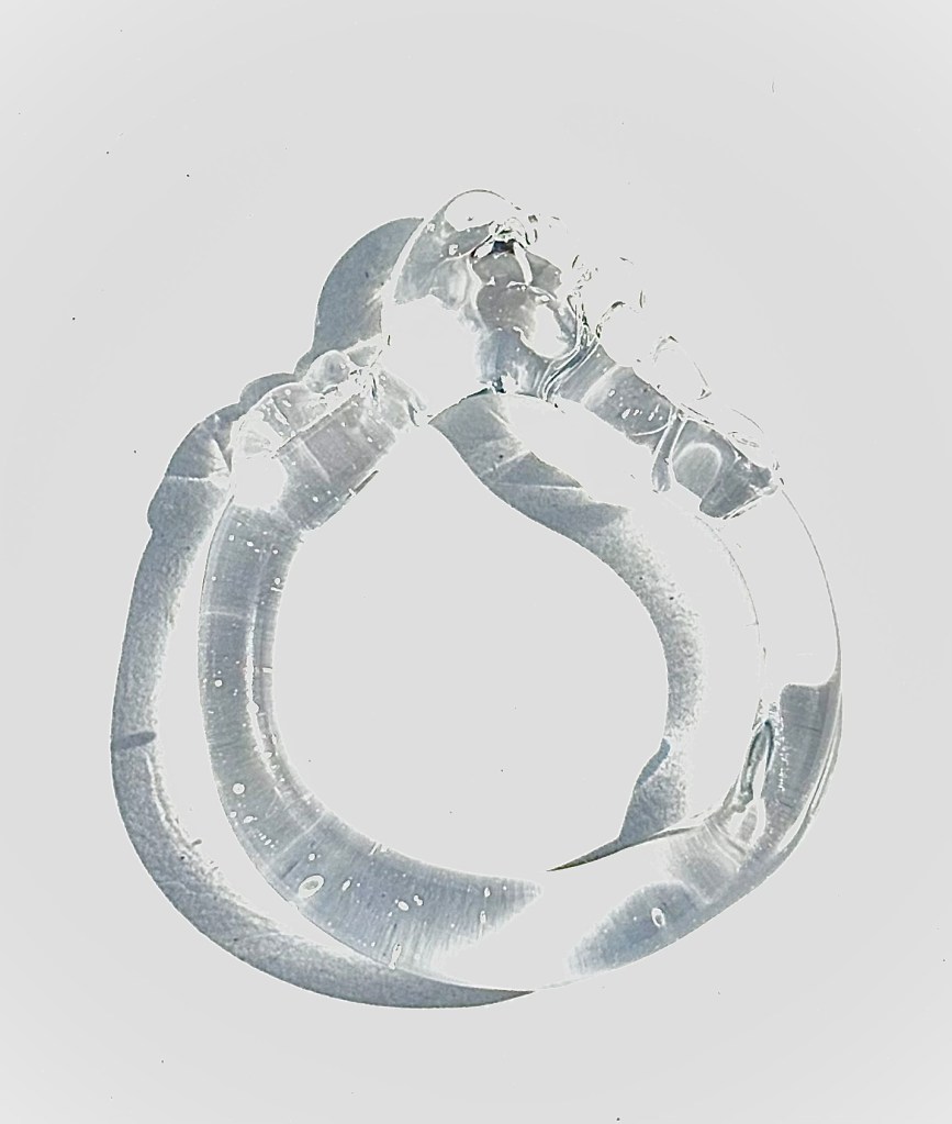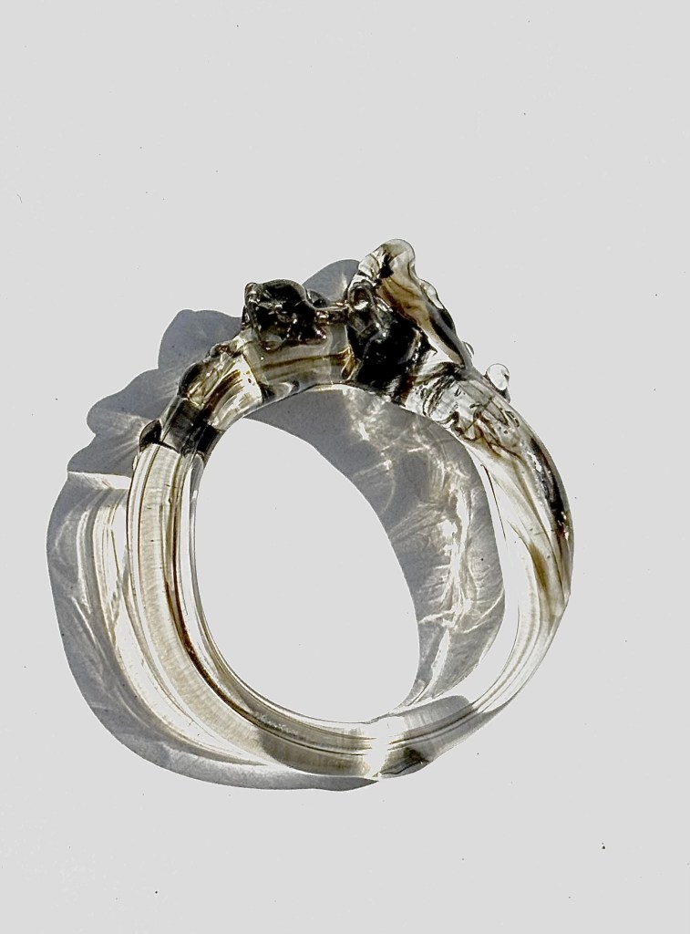 Le verre incarne la dualité entre la force et la douceur. Se transformant en bijoux de courant translucide couleur azur.